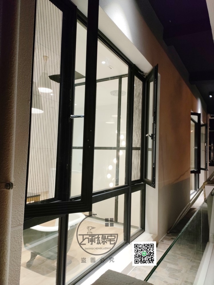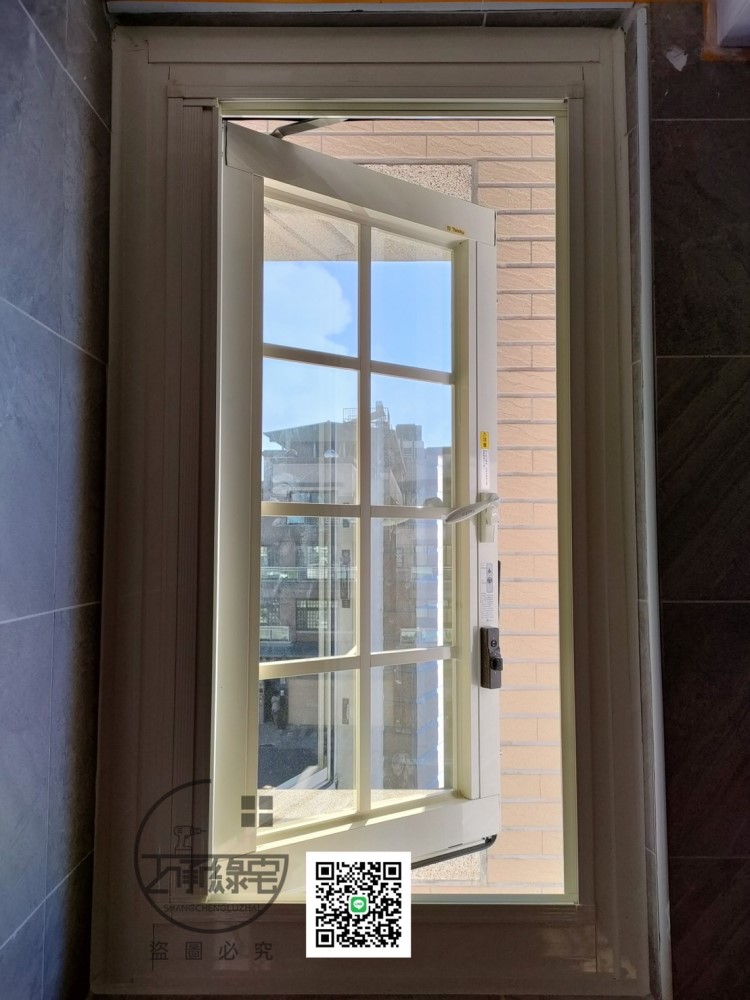 四周都為氣密膠條,透過擠壓原理達到阻斷空氣進入並隔絕聲音,隔音效果為佳,但無法與橫拉窗相比,開度只能為90度,並且只能使用摺疊紗窗。